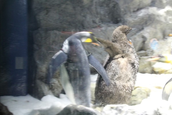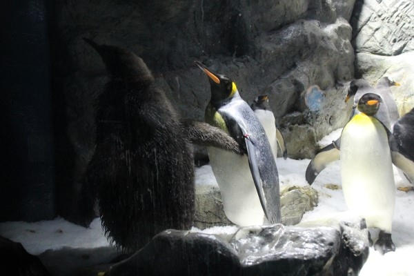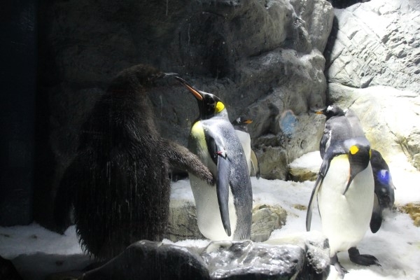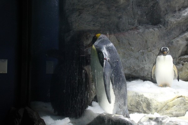 キングのヒナちゃんにゾロゾロついてきたオトナたち。行き止まりでガラス際の人間を観察するヒナ、先頭にいるオトナにヒナのフリッパーが触れています。