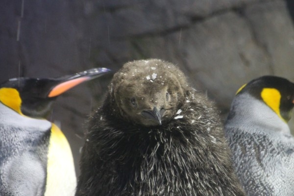 海遊館のキングひな、オトナと一緒にカキ氷の雪をあびています。ヒナの羽は暖かいけど撥水性がありません。とけたカキ氷の水が羽にしみ込んで寒くないかとちょっと心配ですが、じつはこうして涼んでいるのかも。