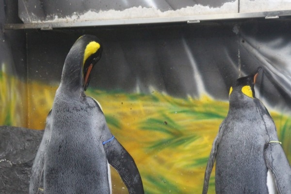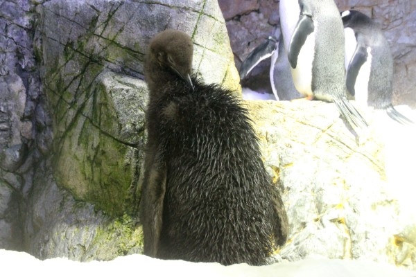海遊館キングのヒナ、羽づくろいする格好は一人前のオトナと同じです。