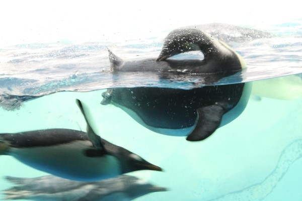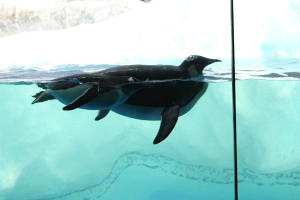 名古屋港水族館で優雅に泳ぐエンペラー。手前の小さなペンギンはジェンツーです。サイズの違いがクッキリ。それにしても、エンペラーの首って、短い。