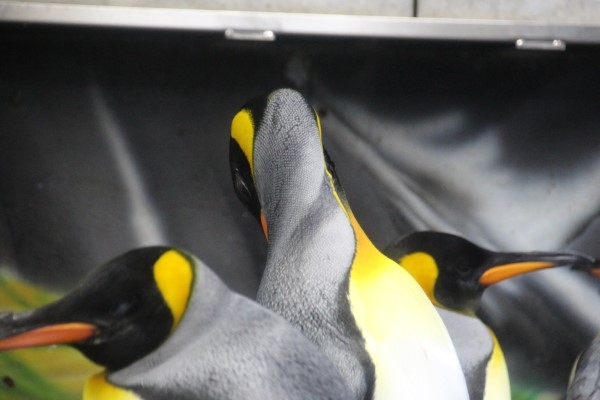 越前松島水族館のキング、羽づくろいに熱中。首がねじれて、クリスマスのステッキ飴か床屋看板みたいな模様になっています。