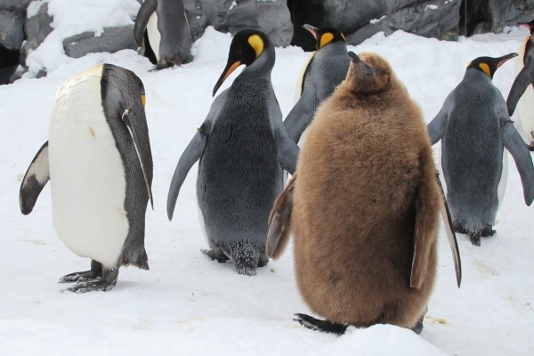 散歩から戻りホッと一息の旭山キングたち。ヒナちゃん、なんか全身でドヤ顔になってませんか? ところで、ヒナの後ろに誰かいるのが、フリッパーが出ているのでわかります。オトナをスッポリ隠してしまうくらい、ヒナちゃんは大きいのですね。