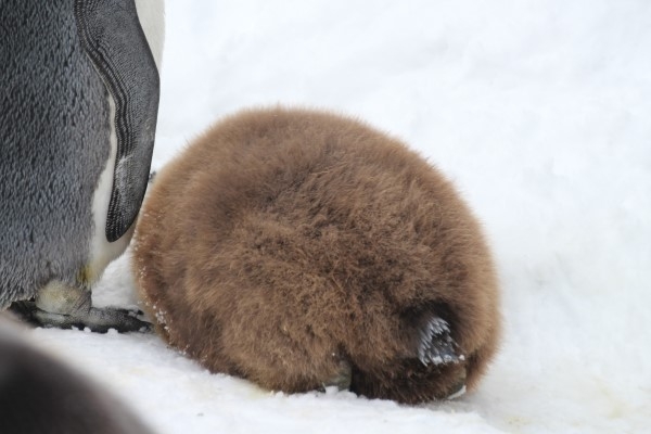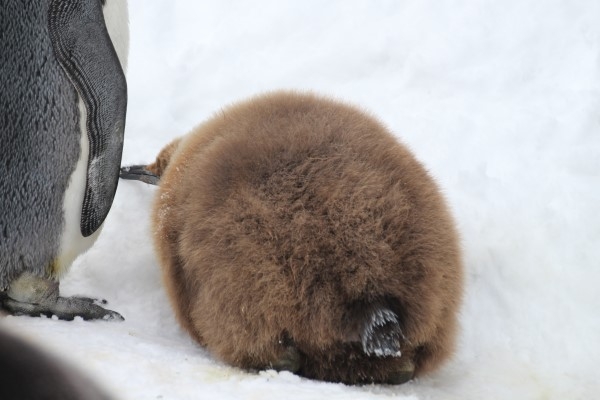 旭山動物園のキングひな、やっぱりお母さんの近くが安心できるみたいです。足とフリッパーを引っ込めて寝転がると、なんだかわからない『ふわふわ物件』ですね。でもよく見るとオトナと同じシッポが。