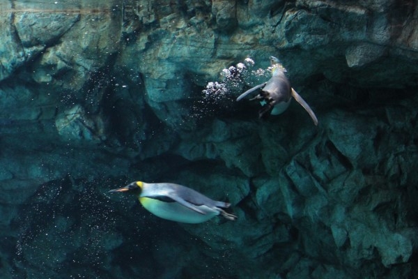 海響館です。深いプールを悠然と泳ぐキングと、もう1羽は・・・? キングのようだけど、トレードマークの黄色いイヤーパッチがあるのかないのか、泡に隠れてよく見えません。