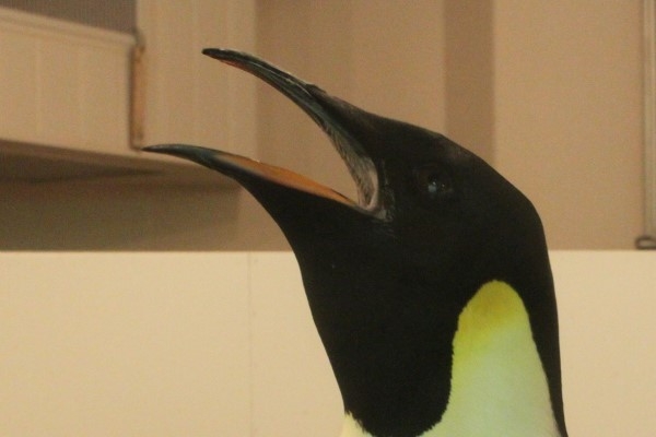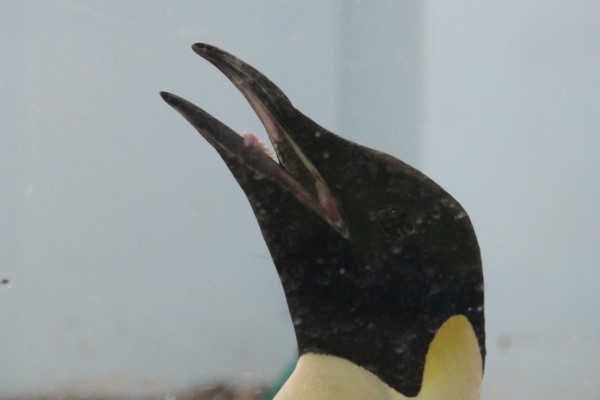 別の白浜皇帝がお口を開けたところ。改めて見ると、お顔に対してクチバシは控え目な感じです。極寒の地に棲むエンペラーは、でっぱりを少なくして防寒対策としているのだそうです。