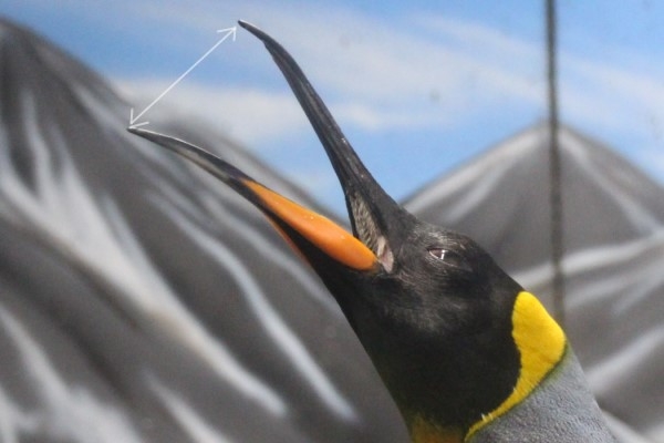 気持ちよさそうにアクビをする越前王。口を開けたときのクチバシ先端間の距離(矢印)は、18種のペンギンの中でキングが最大だそうです。よく見れば、お顔に対してクチバシがとっても長い。