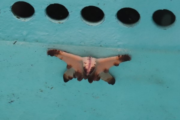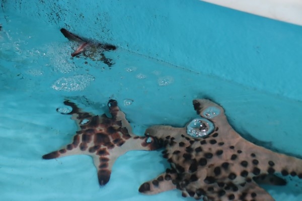 越前松島水族館のタッチングプールで、ヒトデがプールの壁にくっついて、こんなアクロバティックな謎ポーズをしていました。