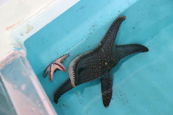 どうやら、水の外に身体が出るのを防いでいるようです。容れ物に入って直方体になった水の形に身体を沿わせているヒトデたちでした。