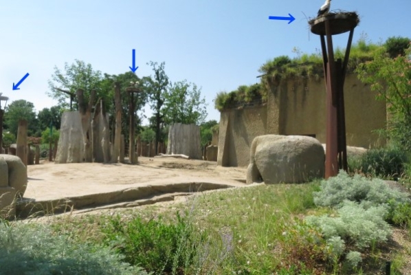 ペンギンのついでに、ここはゾウのエリアです。でも、ゾウは本日気分が乗らないようで、物陰に隠れています。塔の上に巣(矢印)をかけているのは、コウノトリのようです。