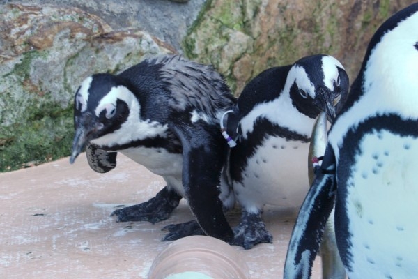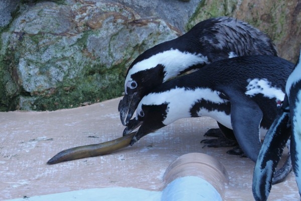 「わるいな、これはワシのもんや。」 さっとサカナを取り上げて、ライバルのクチバシから逃れました。負けたケープは、まだサカナを横目で見ています。奪い合いしなくても、ちゃんともらえるのですが。@アドベンチャーワールド。