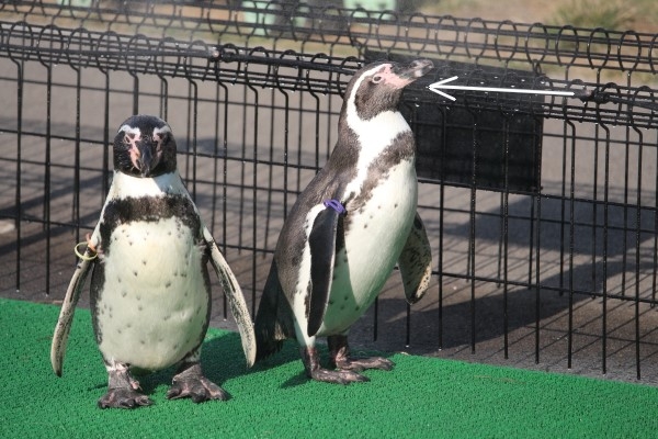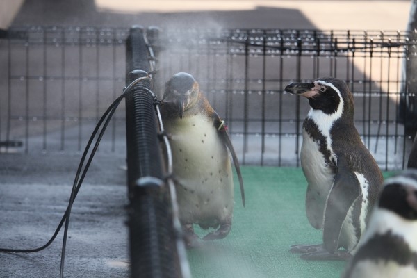 2羽のフンボルト、右は直線的に吹き出すミストをダイレクトに顔に当てています。ピンク色の肌露出部分はもともと放熱用ですので、ここにミストは効きますね。