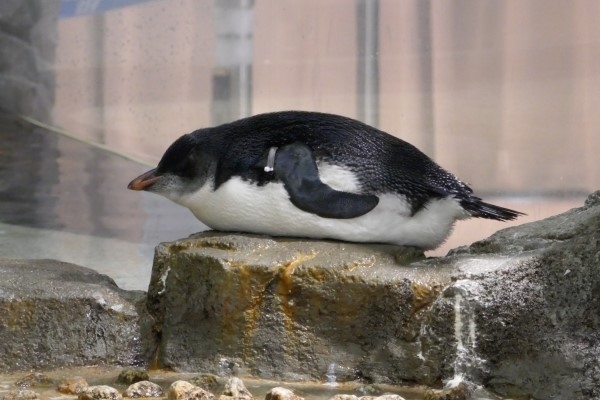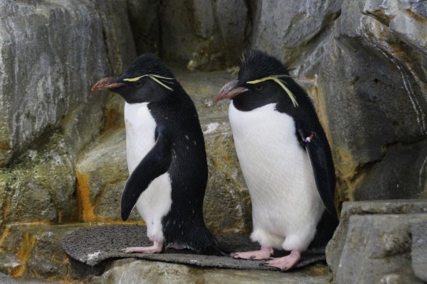 海遊館のイワトビはミナミイワトビ。手前にいるもふもふはヒナです。親と同じ大きさまで育ちました。