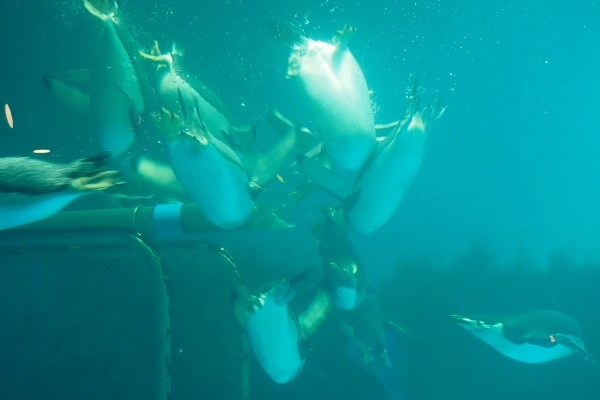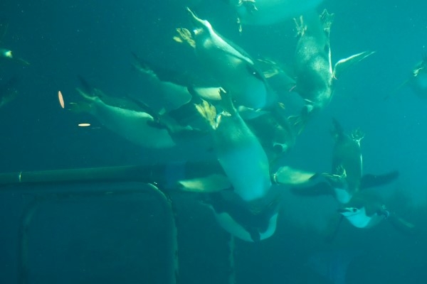 長崎ペンギン水族館の大水槽に設置されたフィーダーは、水の勢いでパイプからサカナが飛び出す仕掛け。始まると、あっという間にランチバイキング会場のローストビーフ前?みたいになります。