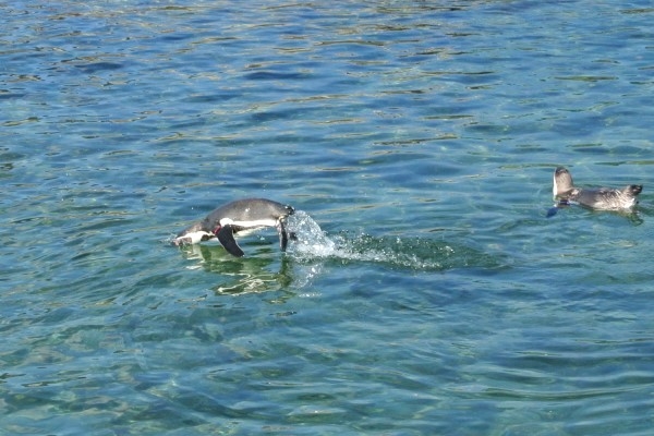 長崎ペンギン水族館のペンギンビーチは、小さな入り江を仕切った天然プールです。フンボルトがイルカのようにジャンプしました。足が水から出ると同時に顔が着水、小さなジャンプです。