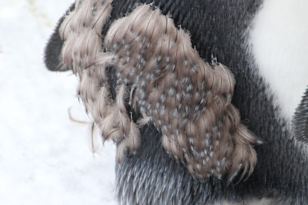 旭山動物園のキング1羽、雪の中、早くも換羽中。胴体はほぼ終了、ちょうどお顔がタイヘンなことになっていました。ちょっと、春から夏に見られる柴ワンコの換毛みたいな感じ。ペンギンの換羽は年に1度。春の婚活シーズンを前に、きれいな羽に着替えます。