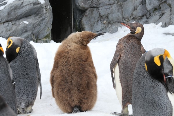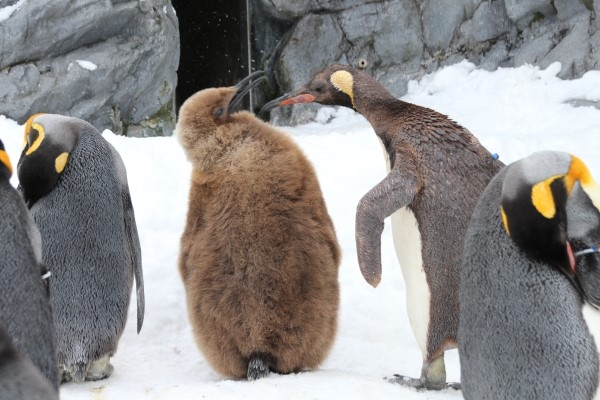 「なんでちゅか?!」 旭山動物園のキングヒナちゃん、オトナに言いがかりをつけられているようです。お母さん(左)はお昼寝中。