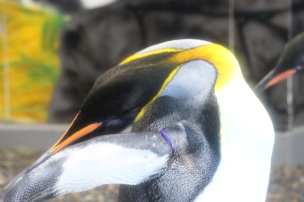 で、下顎から首元のオレンジ色部分までの黒いところ、まん中が分け目みたいになっています。しかも、分け目の所が何となく黄色っぽい。キングの頭の黒い羽はときどき黄色いパウダーをかけたように見えることがありますが、こちら側もそうだったとは。