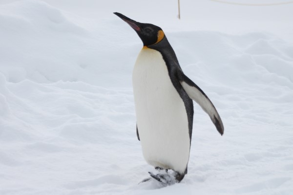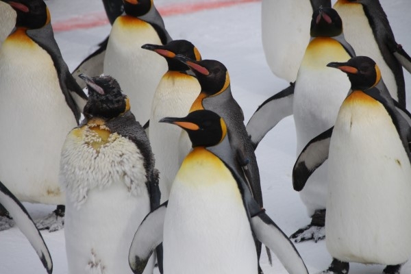 旭山動物園ペンギンの散歩で絶好調のキング亜成鳥です。下クチバシの色が黒っぽくくすんでいますし、首元のオレンジ色が目立ちません。前の冬にはもふもふのヒナだったのですね。
