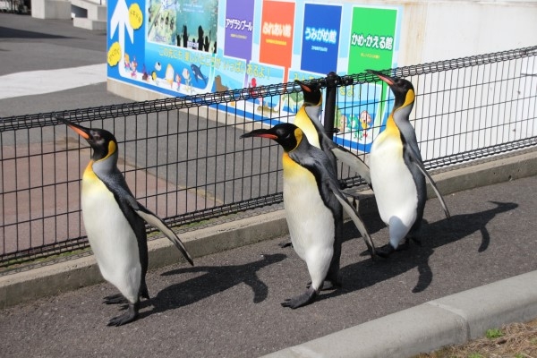 こんなふうに、ペンギンと影法師だけ、という嬉しいシーンにはなかなか巡り会えません。どちらも越前松島水族館の冬期限定キングの散歩風景でした。