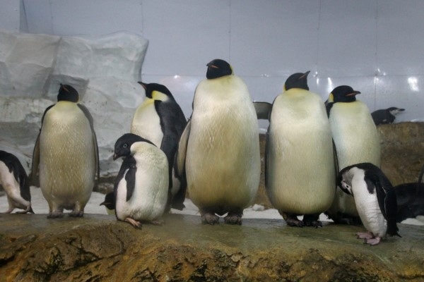 アドベンチャーワールドのエンペラー、5羽並んでいますが、真ん中の御方がずいぶん立派ですね。左端は目立って小柄。エンペラーの体重は30kgから40kgということですが、10kgは率でいうとすごい差になります。個体差以外に、これからまだ成長する亜成鳥はかなり小さめですし、メスはやや小柄のことが多いようです。