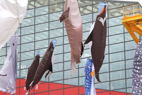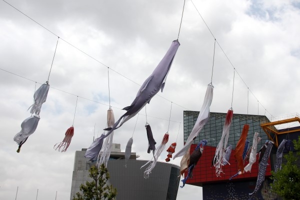 海遊館前で五月の空を泳ぐのは、コイのぼりならぬクラゲのぼり、イカのぼり、サメのぼり、そしてもちろん、