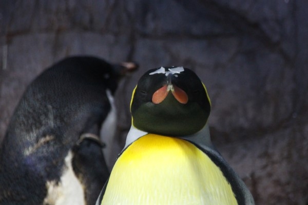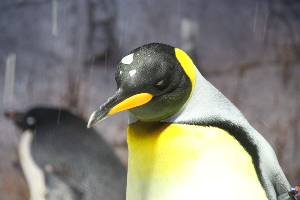 海遊館のキング、人工雪すなわちカキ氷を浴びていたので、頭に氷片がくっついたまま。気にならないのか、わざとなのか、じっと静かに佇んでいます。