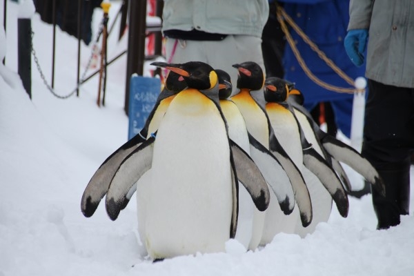 涼しげなペンギン風景をどうぞ。旭山動物園のペンギン散歩、たいていは気温マイナス何度かの中でペンギン様の御成をじっと待つのでございます。