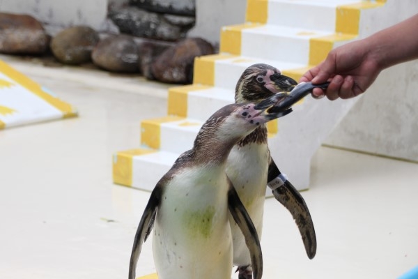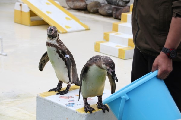 おたる水族館のペンギンショーは、自由すぎるペンギンが売りもの。天然のお笑いをどうぞ。まずは低い飛び込み台。「おサカナを食べたら、いきましょう!」 若鳥君、やる気満々というか、食べる気合い充分です。
