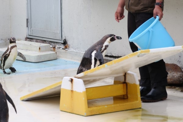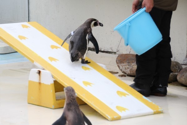 おたる水族館のペンギンショー、お次の種目はシーソーです。エサバケツから目を離すことなく移動するフンボルト。見事です。