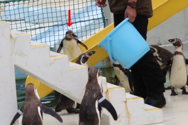 おたる水族館のペンギンショー、お次の種目はすべり台。フンボルト若鳥君大活躍です。長いすべり台を、バケツをのぞき込んだままトテトテと歩いて降りてきます。決して滑りません。