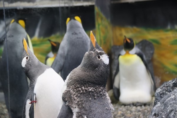 「鏡よ鏡、わたし換羽が済んだらきれいかしら?」「はい、このとおりでございます」・・・じゃないです。奧のキングは鏡像とダブルですが、ジェンツーは鏡の前に2羽いるのでした。ついでに、奧の隅っこにいるキングは抱卵中でした。@越前松島水族館