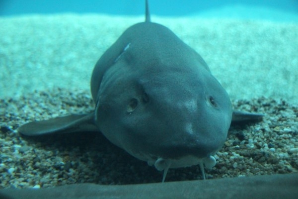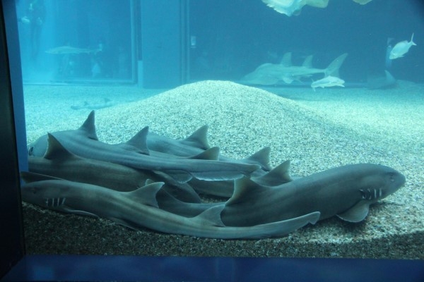 海遊館の大水槽、底の隅っこでおくつろぎ中のイヌザメ集団。おとなしいサメだそうです。
