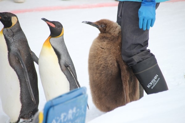 旭山動物園のキングたち、雪道散歩をお楽しみ中。飼育員さんについてもらってヒナもしっかり歩いています。背の高さはオトナと変わりませんが、太さが倍くらい。これは、ヒナの羽毛が長くて、しかもビッシリと立って生えているからで、中身はオトナと同じくらい。でも、もしかしたらちょっとポッテリ体型かも?