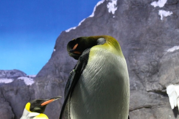 さらに曲がります。こちらは越前松島のキング様。どちらも羽づくろいの途中で耳のあたりを肩にこすりつけるようにしているところです。