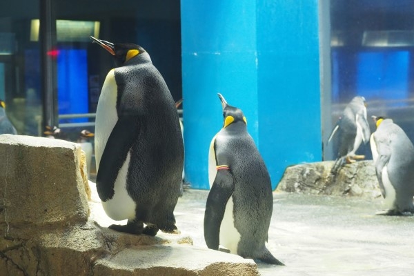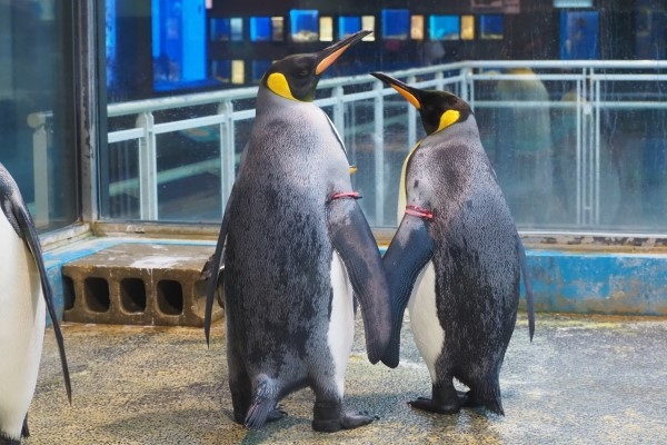 長崎ペン水の仲よさげなキング2羽、体格にずいぶん違いがあります。背の高さにもかなり差がありますね。