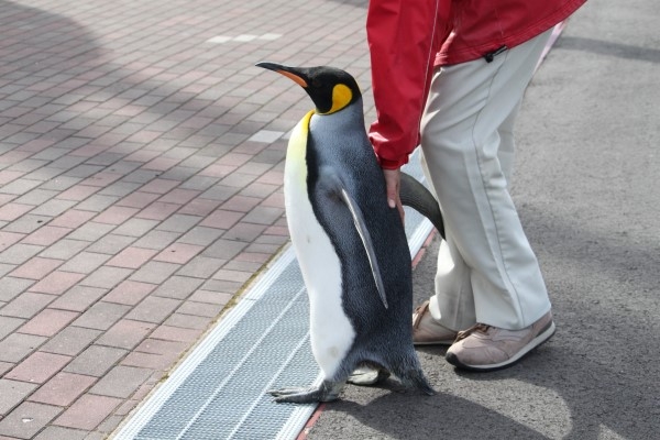「王様、お急ぎください。」 「せかすでない。」 アドベンチャーワールドにて、なつかしの一コマ。お忍び?散歩から戻るキングと飼育員さんです。
