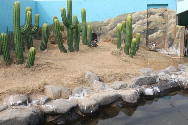 越前松島水族館の旧ぺんぎんらんど、土の陸場にサボテン(偽物)がにょきにょきと立っています。フンボルトペンギンの野生環境はチリやペルーの乾燥した海岸沿いで、サボテンの生えている地域もあります。フンボルトは地面に穴を掘って巣を作ります。