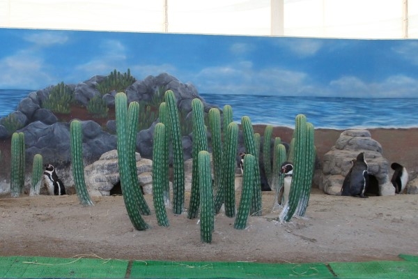 その後、ぺんぎんらんどは引っ越しして大規模になりました。陸場全体に大屋根がかかっているので、直接の雨はかからず、さらに野生環境に近づきました。そこで、上の写真とサボテンを見比べてください。上の写真では、サボテンが枝分かれしています。こちらの写真のは枝分かれなし。これ、最初作った時にサボテンの種類を間違っていたので、作り直したのだそうです。一本立ちの枝別れなしが、野生棲息地に生えているサボテン。