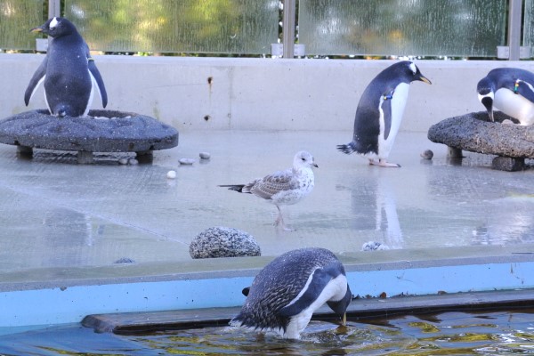 ところで、いつもペンギンばかりですが、他の鳥にも亜成鳥期はあります。まん中は、ペンギンプールに遊びに来ているカモメの仲間(?)の亜成鳥です。白や背中灰色の姿が思い浮かぶカモメ、彼らの若い頃はこんな色でした。@ベルゲン水族館