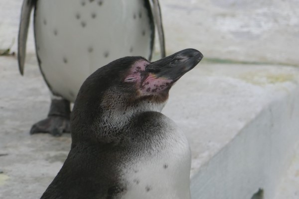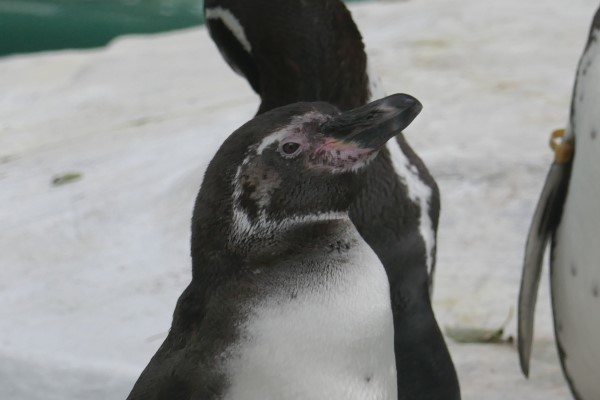 天王寺動物園のフンボルト、成鳥と亜成鳥2羽です。亜成鳥Aは先輩、Bは後輩です。成鳥と見比べてください。どちらも胸に一本線はありません。でも、顔の模様はなんか違う。
