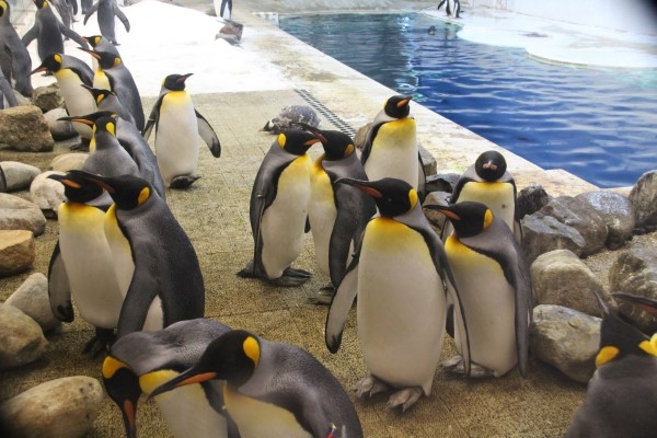 さて、アドベンチャーワールドのペンギン王国におけるキングの場所取り、出足が遅れた第3陣は通路に立つしかありません。見たところ産卵はまだです。通路は休憩に出たりする個体の通行もありますし、隣との物理的な境界がありませんから、子育てには不利。彼らは巣を作らず、抱卵姿勢でクチバシを伸ばして届く範囲をテリトリーとします。