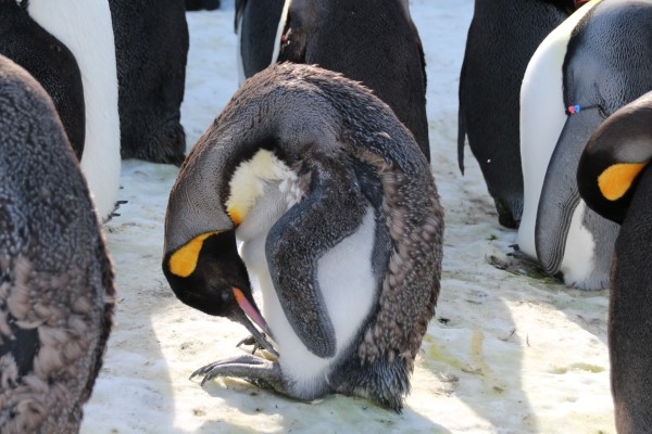 こちら。キングの換羽なのでございます。どのペンギンも年に1度換羽をしますが、何しろキングは身体が大きいので抜け落ちる羽の量も多く、目立ちます。古い羽が盛り上がるようになって落ちると、ピカピカの新羽が現れます。その年間最美な姿で婚活に入ります。
