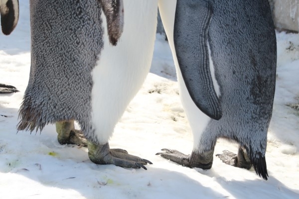 旭山動物園のキング、たまたま並んで立っていた2羽が、換羽前(左)と換羽後(右)の見本のようです。年に1回、全身の羽が生え替わります。キングの場合は繁殖期前に換羽しますので、春頃になります。春先になると、一足先に換羽が始まる個体が見られます。たまに、換羽を1回キャンセルしてしまう個体もいます。