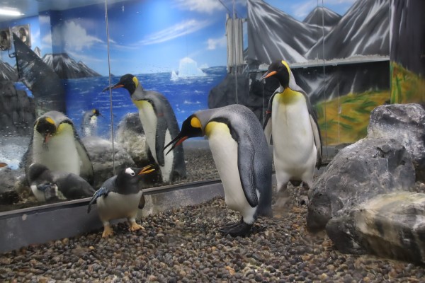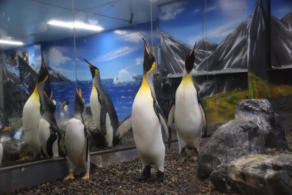 越前松島水族館のキングとジェンツーが、競い合うように首を伸ばして鳴いています。