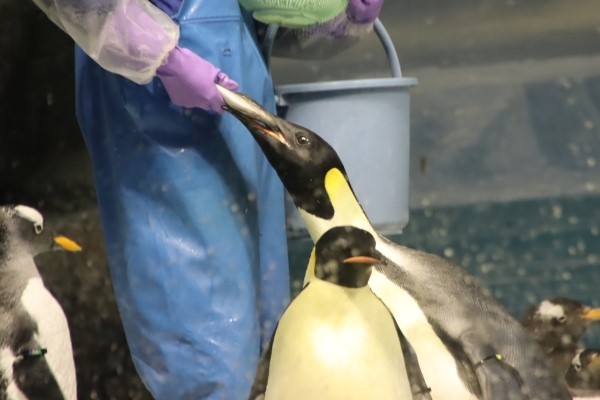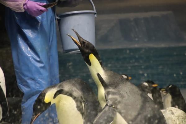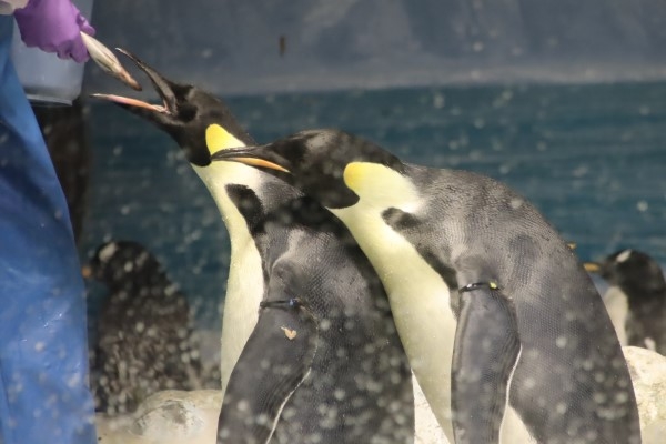 名古屋港水族館のエンペラー、お食事タイムです。先にいただいている青帝(バンドに青ビーズ)にのしかかるようにして飼育員さん(=サカナ)に接近しようとする黄色帝。