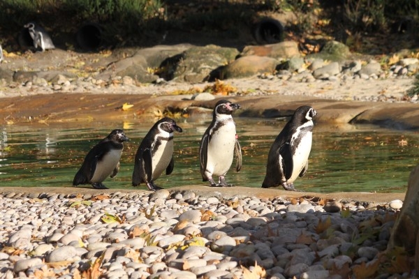 落ち葉、赤みを帯びた光、秋のペンギンプールサイドを行くフンボルト。そう見えるのはロンドン動物園の冬景色でした。
