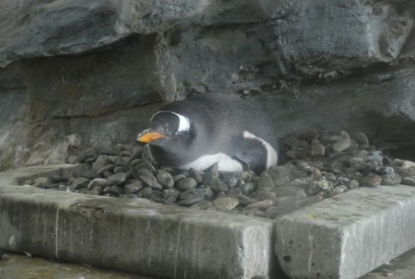 旭山動物園の屋内に巣を構え抱卵中のジェンツー。小石を積み上げるやり方は野生棲息地でのスタイルです。地面よりも高くして、タマゴやヒナが雨などの水につからないようにしています。小石集めは野生では大変ですが、飼育環境では専用に用意されたり、もとから小石を敷き詰めてあったりするので、好きなだけ集めることが出来そうです。