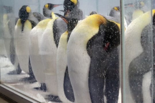 見るからに寒い。冬のプールを楽しむ、旭山のジェンツーです。水面の白い部分は、飼育員さんが投入した雪で...