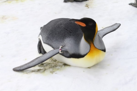 冬のペンギンといえば、やっぱりこれ。雪上キングです。気持ちよくおくつろぎ中ですが、起き上がったら白い...