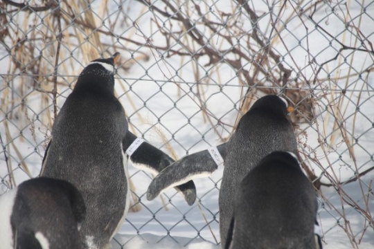 おたる水族館、フェンスぎわに、仲良しな2羽がさりげなく仲良さそうなポーズで佇んでいました。
